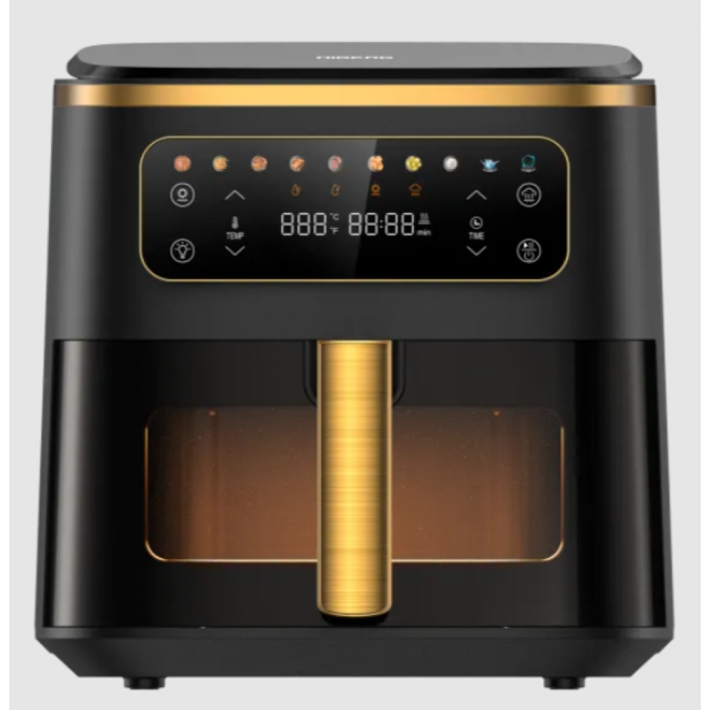 Электрический аэрогриль выполнен в белом цвете с золотом. Большое прозрачное окно и внутренняя LED-подсветка чаши дают возможность наблюдать за процессом готовки без остановки программы.