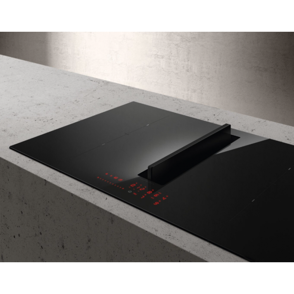 Вытяжка в варочной панели имеет 4 скорости и работает в режиме отвода. В ее комплектацию входят алюминиевый жироулавливающий фильтр и и керамические угольные фильтры длительного использования. Есть индикация загрязнения фильтров. Вытяжка относится к А-классу энергоэффективности. Ее максимальная производительность составляет 1200 м³/ч.