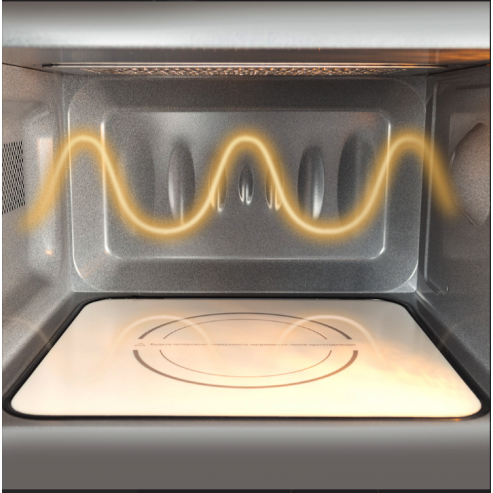 Еще одно уникальное преимущество модели — стеклокерамическое дно без поворотного стола. Микроволновое излучение исходит со дна камеры, благодаря чему обеспечивается равномерный нагрев пищи. На гладкую поверхность можно ставить посуду любой формы и размера, разогревать или размораживать несколько блюд одновременно. Кроме того, за стеклокерамическим дном легко ухаживать, оно безопасно в использовании. Камера оснащена эмалированным покрытием, оно устойчиво к механическим повреждениям, удобно в уходе, легко очищается.